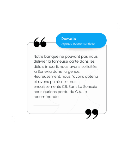 En premier lieu une carte de domiciliation bancaire contient des données essentielles d’identification. En effet, cette précieuse carte comporte, entre autre, le nom de votre entreprise, votre numéro commerçant et votre RIB. En bref, sans carte de domiciliation bancaire aucun encaissement CB n’est possible sur un terminal de paiement. Par conséquent, vous pourrez encaisser la CB dès lors que les données de domiciliation seront enregistrées sur votre appareil. Ensuite il faut savoir que la carte de domiciliation Sonexia est compatible avec toutes les banques traditionnelles et banques en lignes françaises. De surcroît vous pouvez la commander d’un simple clic sur sonexia.fr, d’autant plus que sa délivrance s’effectue en 24/72h. Sans compter que contrairement aux banques traditionnelles, ni aucun bilan, ni aucun prévisionnel n’est requis pour souscrire. Mais aussi qu’aucun chiffre d’affaire minimum n’est imposé. Enfin notre service est sans abonnement et sans engagement avec une simple commission par transaction.