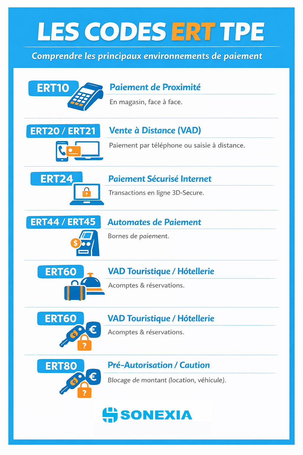 Un code ERT (Environnement de Règlement Technique) est, pour faire simple, une catégorie qui décrit le contexte dans lequel une transaction est réalisée. Ce code est associé à chaque paiement effectué avec votre TPE puis transmis à votre banque via le réseau CB.